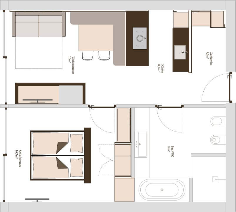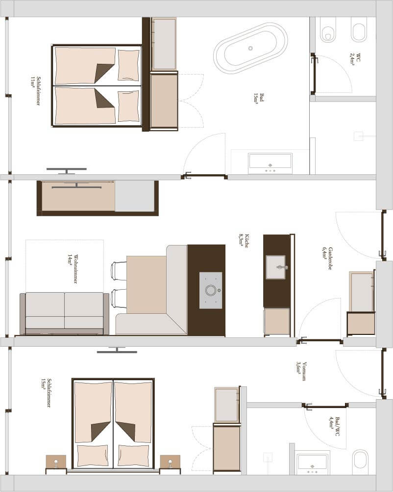 Lussuoso appartamento per vacanza per 4-6 persone con due camere da letto e salotto con divano letto e cucina