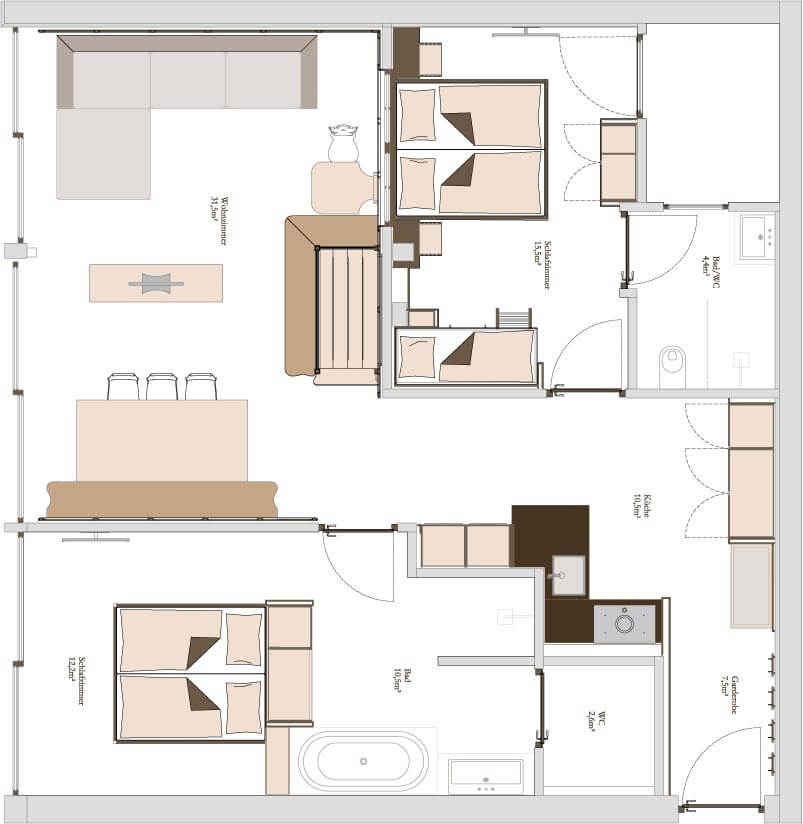 Naturale. Tradizionale. Semplice. Bello. Legni di cirmolo invecchiati e profumati, grandi vetrate, morbida stoffa di Loden: l’armonia e la semplicità dell‘arredamento permettono di vivere in un ambiente tipicamente alpino. Lo scenario montano mozzafiato, la posizione e il contesto unici rendono le mountain home davvero eccezionali.